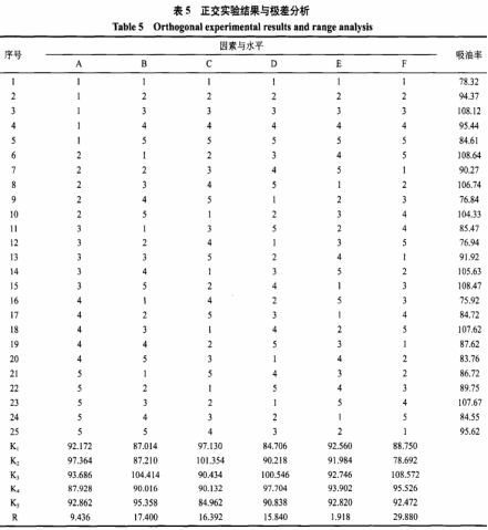 由表5得知,六個要素對多孔結(jié)構(gòu)木薯淀粉吸油率危害的先后順序?yàn)椋篎>B>C>D>A>E。依據(jù)偏差剖析能夠得到微波加熱超音波輔助酶打法制取多孔結(jié)構(gòu)木薯淀粉的最好工藝技術(shù)標(biāo)準(zhǔn):A2B3C2D3E4F3,即微波加熱輸出功率為130W、微波加熱時間為40min、加酶量為9U/g、管理體系pH為5.4、超音波輸出功率450W、反映溫度為45℃。歷經(jīng)認(rèn)證性試驗(yàn),在最好工藝技術(shù)標(biāo)準(zhǔn)下配制的木薯多孔結(jié)構(gòu)木薯淀粉的吸油率為118.63%,比一般酶打法制取的木薯多孔結(jié)構(gòu)木薯淀粉吸油率提升了32.93%。