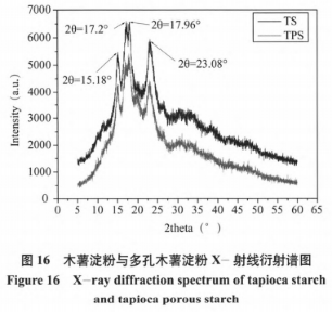 圖16是木薯淀粉與多孔結(jié)構(gòu)木薯淀粉X-放射線透射譜圖,從圖上能夠看得出木薯淀粉在2θ=15.18A,17.2A,17.96A和23.08A有四個特點峰,歸屬于規(guī)范的A型構(gòu)造。如圖所示18中還可以看得出,與木薯淀粉對比,經(jīng)過微波加熱超音波輔助酶打法解決的多孔結(jié)構(gòu)木薯淀粉仍然具備類似的特點峰,僅僅峰型有一定的轉(zhuǎn)變,表明經(jīng)過微波加熱超音波功效沒有使木薯淀粉的分子結(jié)構(gòu)產(chǎn)生明顯更改。