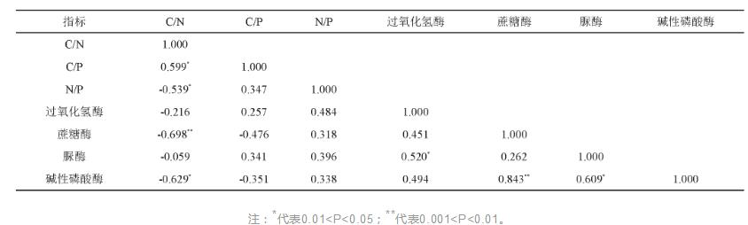 由表2得知,C/N與C/P呈明顯成正比,與N/P呈明顯成反比,C/P與N/P呈正相關(guān)的關(guān)聯(lián),這類正負(fù)極關(guān)聯(lián)性說明三者間普遍存在著相互影響、均衡及牽制關(guān)聯(lián)。過氧化氫酶活力與脲酶活力呈明顯成正比,與C/N呈反比關(guān)聯(lián);綿白糖酶促反應(yīng)與堿性磷酸酶活力呈明顯成正比,與C/N呈明顯成反比,與C/P呈反比關(guān)聯(lián);脲酶活力與堿性磷酸酶活力呈明顯成正比,與C/N呈反比關(guān)聯(lián);堿性磷酸酶活力與C/N呈明顯成反比,與C/P呈反比關(guān)聯(lián)。表明土壤層綠色生態(tài)有機(jī)化學(xué)計(jì)量學(xué)特點(diǎn)與土壤層酶促反應(yīng)存有一定的關(guān)聯(lián)性。