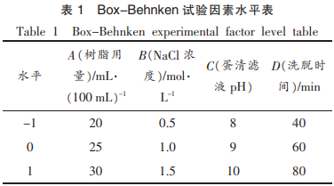 在單要素實驗的根基上,挑選環(huán)氧樹脂使用量(A)、過柱液NaCl濃度值(B)、雞蛋清滲瀝液pH值(C)、過柱時間(D)4個要素,每一個要素選擇低、中、高3個水準(表1),選用4要素3水準的回應(yīng)斜面方式設(shè)計方案實驗,并以溶菌酶比魅力為指標值,明確最好獲取加工工藝。