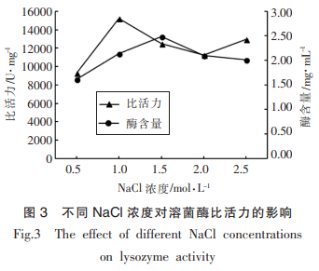由圖3得知,隨NaCl濃度值的上升,溶菌酶的比魅力先升高后降低,當(dāng)NaCl濃度值為1moL/L時(shí),所得的溶菌酶的比魅力最大,這時(shí)的過(guò)柱液濃度值適合獲取分離出來(lái)溶菌酶。當(dāng)NaCl濃度值高過(guò)1moL/L時(shí),酶的比魅力反倒降低,酶成分轉(zhuǎn)變卻并不大,很有可能因?yàn)槿芫冈跐舛容^高的溶液中產(chǎn)生蛋白質(zhì)變性功效造成 。
