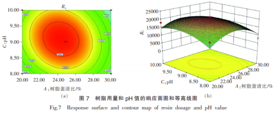 由式子得知,溶菌酶比魅力和4個(gè)變量中間具備明顯線性相關(guān)。線性回歸方程的二次項(xiàng)系數(shù)較為大,交互項(xiàng)指數(shù)中AD、BD的互動(dòng)指數(shù)非常大,表明環(huán)氧樹(shù)脂使用量和過(guò)柱時(shí)間、NaCl濃度值和過(guò)柱時(shí)間之間的互動(dòng)效用非常大,AB、AC的互動(dòng)指數(shù)比較大,表明環(huán)氧樹(shù)脂使用量和NaCl濃度值中間、環(huán)氧樹(shù)脂使用量和pH值中間互動(dòng)效用比較大,而B(niǎo)C、CD的互動(dòng)指數(shù)較為小,表明NaCl濃度值和pH值中間、pH值和過(guò)柱時(shí)間之間的互動(dòng)效用小。