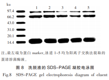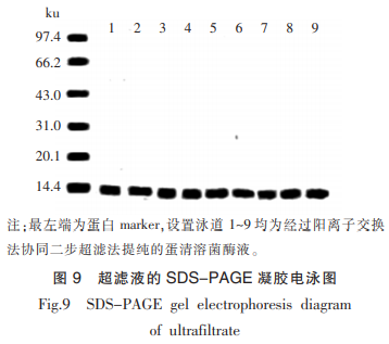 由圖8、圖9比照得知,過柱液和超滲瀝液均可在14.4ku看到顯著雜帶,與雞蛋清溶菌酶的相對性分子質(zhì)量相符合。除此之外,只歷經(jīng)陽離子交換的過柱液的雜蛋白質(zhì)及殘?jiān)}較多,危害純凈度,而過柱液歷經(jīng)二步超濾膜后,雜蛋白質(zhì)、殘?jiān)}較少,獲取的溶菌酶純凈度較高。