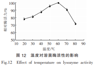 由圖12得知,在20~60℃時(shí),溶菌酶相對性酶活隨環(huán)境溫度上升遲緩升高,且相對性酶活均在78%之上,溫度功效覆蓋面廣;在60℃時(shí),酶活做到最大值,若再次提溫,則酶活降低較快。其很有可能是由于超低溫時(shí)隨氣溫升高分子熱運(yùn)動加速,提升 了反應(yīng)速率,而當(dāng)氣溫抵達(dá)60℃后,隨反映溫度的上升,雞蛋清溶菌酶慢慢降解,促使酶促反應(yīng)降低。