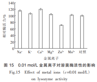 由圖15得知,Na 、Ca2 對溶菌酶有極強(qiáng)的激話功效;K 對溶菌酶激話功效較差;而Zn2 對溶菌酶活力有極強(qiáng)的抑制效果;其他金屬離子(Mg2 、Mn2 )對溶菌酶活力無顯著危害。故除少數(shù)離子對溶菌酶活力有抑制效果外,絕大多數(shù)金屬離子對酶活不容易造成干擾或具有激發(fā)功效,即絕大多數(shù)金屬離子與溶菌酶具備優(yōu)良的搭配功效。