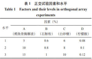 以銀鱈魚骨酶解液、石斛粉、白糖、檸檬酸鈉加上量為實驗要素,設(shè)計方案4要素3水準(zhǔn)的正交實驗,要素水準(zhǔn)表見表1,以感觀得分為指標(biāo)值。
