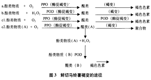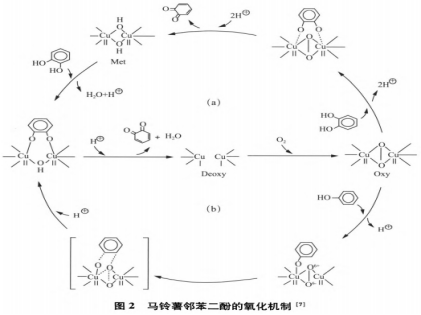 多酚氧化酶(Polyphenoloxidase,PPO)是綠色植物身體普遍現象可被分離出來純化得到的酚酶,其構造為每一個亞基含有一個Cu2 做為輔基,以氧做為受氫體的一種尾端抗霉素。酶是蛋白組成的生化反應金屬催化劑,PPO催化反應的化學反應分成兩大類:一類是甲基化功效,造成酚的鄰甲基化;二類是化學作用,使鄰苯二酚空氣氧化為鄰醌。植物細胞內的酶當做光合作用的傳送物質,維持著酚一醌的穩(wěn)定平衡,當體細胞遭到機械設備傷害后,O2很多入侵造成 醌類的持續(xù)轉化成,導致酚和醌中間的失調,而醌的累積促使醌開展多聚化生成深褐色素,導致營養(yǎng)成分遺失。土豆鄰苯二酚的空氣氧化體制見圖2。