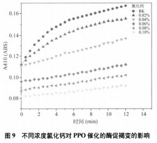 (6)測量不一樣濃度值CaCI2對土豆PPO催化反應(yīng)的酶促褐變的危害
