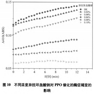 (7)測量不一樣濃度值異抗壞血酸鈉對土豆PPO催化反應(yīng)的酶促褐變的危害