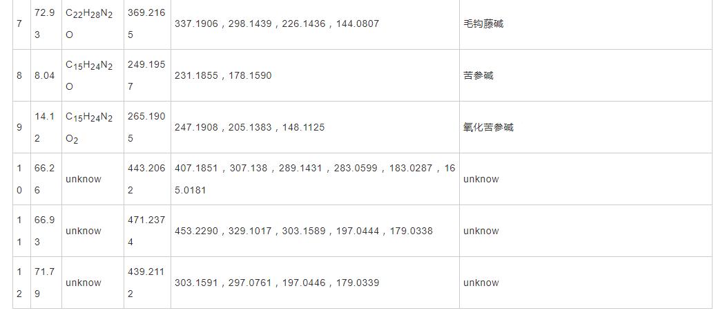 化學(xué)物質(zhì)7:來自鉤藤,保存期72.93 min,共價鍵方式,其準分子離子為m/z369.2165 ,二級質(zhì)譜分析表明其關(guān)鍵殘片m/z337.190 6,298.143 9,226.143 6和144.080 7,各自為標準分子離子遺失CH3OH、C4H9N、C10H9N和C12H19NO3的殘片,融合參考文獻基本推斷化學(xué)物質(zhì)7為毛鉤藤堿。