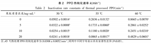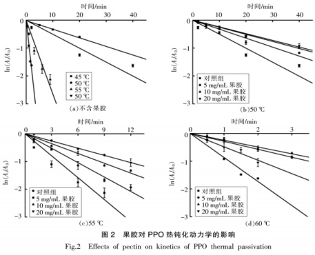 熱鈍化處理溫度范圍為45~60℃時,阿拉伯膠對PPO熱鈍化處理動力學模型的干擾如圖2所顯示,其熱鈍化處理速度如表2所顯示。由圖2a得知,在沒有含阿拉伯膠的情形下,經45℃熱處理工藝后PPO產生輕度鈍化處理,熱處理工藝20min后PPO活力仍維持在50%之上,其鈍化處理速度為0.0308min-1。伴隨著解決溫度的上升,PPO熱鈍化處理速度慢慢加速,經55℃熱處理工藝3min后PP0相對性活力僅為33.5%:當環(huán)境溫度上升至60℃時,熱處理工藝1min可讓PP0活力減少50%之上,2min后PPO基本上降解,鈍化處理速度為0.8665min-1。阿拉伯膠的添加使PPO對熱鈍化處理的敏感度減少。在相對性柔和的熱處理工藝前提下(50℃),PPO熱鈍化處理速度為0.0502min-1,而5mg/mL阿拉伯膠使PP0熱鈍化處理速度減少至0.0322min-1(圖2b)。伴隨著阿拉伯膠濃度值的提升,PP0熱鈍化處理速度漸漸降低,當阿拉伯膠濃度值上升至10mg/mL時,PPO熱鈍化處理速度降低至0.0254min-1。熱處理工藝溫度上升至55℃時,PP0的熱鈍化處理速度具備同樣的發(fā)展趨勢(圖2c),5,10,20mg,mL阿拉伯膠使PPO熱鈍化處理速度由0.2636min。一分別降低至0.1733,0.1180,0.0865min-1。從圖2d能夠看得出,伴隨著熱處理工藝溫度持續(xù)上升,60℃熱處理工藝2min使PPO活力降低至19.7%,而5mg/mL和10mg/mL阿拉伯膠能使PP0活力各自維持為56.2%和58.0%,其熱鈍化處理速度各自減少了0.5804min。1和0.6214min-1。研究組早期科學研究報導菌類PP0對熱十分比較敏感,高溫短時間或超低溫長時熱處理工藝均能合理鈍化處理其活力。本實驗結果顯示阿拉伯膠能提高PP0在50~60℃范疇內的耐熱性,且這類提高功效展現(xiàn)一定的濃度值依賴感。有科學研究報導稱蛋白與阿拉伯膠間的相互影響會更改蛋白的耐熱性.這很有可能與阿拉伯膠在蛋白質表層產生嚴密的網絡架構息息相關圜。熱處理工藝根據誘發(fā)PP0分子產生集聚或去伸縮轉變使其活力減少,網狀結構阿拉伯膠對PP0分子的盤繞或包埋功效很可能維護PP0構造免遭熱鈍化處理的危害,與此同時阿拉伯膠分子結構中羧基官能團的氧分子可與PP0分子中的氫原子產生共價鍵進而提高PPO可靠性,減少其熱鈍化處理速度。因而,蔬菜水果產品如蔬果汁、蔬菜水果泥及蘋果醬等食品類管理體系中阿拉伯膠的出現(xiàn)將會使PPO主要表現(xiàn)出更強的耐熱性,也是PP0在不一樣管理體系中熱鈍化處理動力學模型差別的因素之一。