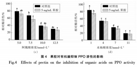 抗壞血酸、檸檬酸鈉、阿魏酸和水楊酸鈉4種有機(jī)物是使用極其普遍且有效的PP0緩聚劑。4種有機(jī)物均能明顯抑止PP0活力且抑制效果主要表現(xiàn)出突出的濃度值依賴感(圖4)。4種有機(jī)物中,抗壞血酸的抑制效果最強(qiáng),次之是水楊酸鈉和阿魏酸,檸檬酸鈉的控制實(shí)際效果較弱。1.2mmol/L抗壞血酸解決使PP0活力減少至53.1%,而要做到同樣的控制實(shí)際效果,水楊酸鈉解決濃度值需做到4mm01/L.阿魏酸解決濃度值需做到7.5mmol/L之上,檸檬酸鈉解決濃度值則需做到15mmol/L。當(dāng)阿拉伯膠濃度值為5mg/mL時,4種有機(jī)物對PP0活力的抑制效果略微提高。1.8mmol/L抗壞血酸解決后,PP0活力的抑制率從56.9%提升至82.6%;15mmol/L檸檬酸鈉解決后,PP0活力的抑制率從52.6%提升至69.3%;7.5mm01/L阿魏酸解決后,PP0活力的抑制率從32.2%提升至43.0%;1mmol/L水楊酸鈉解決后,PP0活力的抑制率從16.9%提升至26.1%??箟难帷幟仕徕c、阿魏酸和水楊酸鈉廣泛具備酸堿性且在其中檸檬酸鈉的酸堿性最強(qiáng)。如表3所顯示,5mmol/L檸檬酸鈉解決后管理體系pH值小于6.0,而15mmol/L檸檬酸鈉解決后管理體系pH值小于5.0。有科學(xué)研究報(bào)導(dǎo)檸檬酸鈉的堿化功效是其對PP0活力造成抑制效果的首要緣故;而抗壞血酸關(guān)鍵由于其強(qiáng)氧化性,能將PP0催化反應(yīng)產(chǎn)生的正中間物質(zhì)醌立即復(fù)原進(jìn)而阻攔色素的轉(zhuǎn)化成;阿魏酸和水楊酸鈉2種脂環(huán)羧基因具備與底物構(gòu)造類似的特性,可以與底物市場競爭PP0融合結(jié)構(gòu)域而造成抑制效果。網(wǎng)狀結(jié)構(gòu)阿拉伯膠盡管也許對PP0分子造成盤繞或包埋功效,殊不知抗壞血酸、檸檬酸鈉、阿魏酸和水楊酸鈉均為小分子水,其簡潔的構(gòu)造使其非常容易與PP0分子產(chǎn)生觸碰。除此之外,阿拉伯膠的酸性可減少管理體系pH值,進(jìn)而提高有機(jī)物對PP0活力的抑制效果。