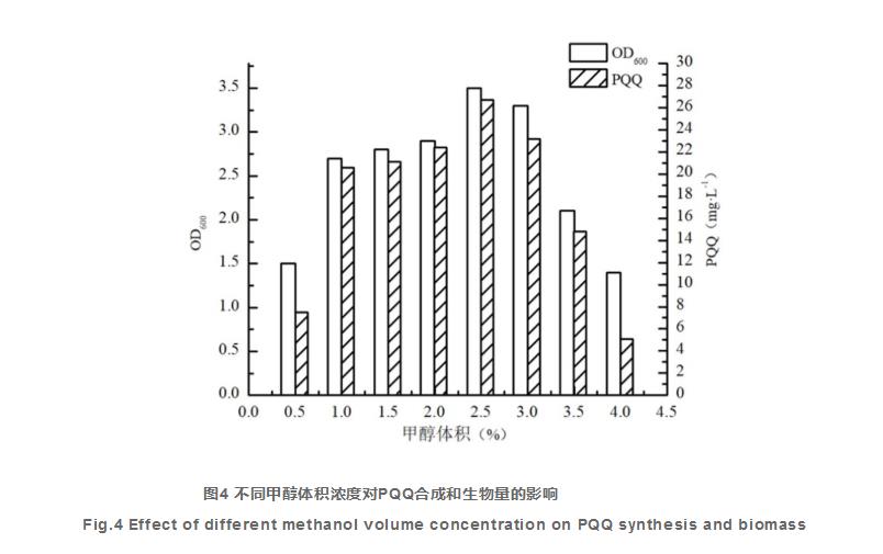 科學(xué)研究工業(yè)甲醇的差異加上濃度值(0.5%,1%,1.5%,2%,2.5%,3%,3.5%,4%)對OD600和PQQ生產(chǎn)量的危害,結(jié)果如圖4所顯示。在0.5%~2.5%的含量范疇內(nèi),伴隨著工業(yè)甲醇容積含量的提升 ,菌體OD600和PQQ生產(chǎn)量也慢慢提升,當(dāng)工業(yè)甲醇濃度值為2.5%時(shí),OD600和PQQ生產(chǎn)量均實(shí)現(xiàn)最大,再次提升工業(yè)甲醇濃度值,OD600和PQQ生產(chǎn)量均有顯著降低。這是由于工業(yè)甲醇做為病菌生長的唯一氮源,而且或是細(xì)菌細(xì)胞工業(yè)甲醇脫氨酶的底物,在其濃度值較低時(shí),不能給予動能使細(xì)胞生長,也不能生產(chǎn)制造過多的PQQ代謝到培養(yǎng)液中,造成 PQQ生成高效率極低。當(dāng)工業(yè)甲醇濃度值慢慢增強(qiáng)時(shí),體細(xì)胞能夠使用的氮源提升,菌體OD600和PQQ生產(chǎn)量也逐步提升;當(dāng)工業(yè)甲醇濃度值超出2.5%時(shí),因?yàn)楣I(yè)甲醇的毒素使體細(xì)胞損害,而且底物濃度值過高抑止工業(yè)甲醇脫氫酶的活性,造成 菌體OD600和PQQ生產(chǎn)量降低。因而,2.5%的工業(yè)甲醇容積濃度值針對菌體生長發(fā)育和PQQ生成是最好的選擇。