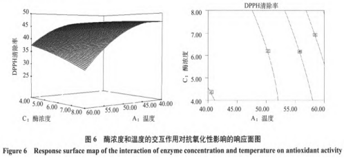 融合表3、圖5及圖6可看得出,危害DPPH氧自由基清除率的順序?yàn)椋簻囟?X1)>pH(X2)>酶濃度值(X3)>酶解時(shí)間(X4),X1、X2、X3、X13項(xiàng)做到互極明顯水準(zhǔn)(P<0.01),X12、項(xiàng)做到明顯水準(zhǔn)(P<0.05)。響應(yīng)面的最佳標(biāo)準(zhǔn):溫度43.47℃,pH為9.19,酶濃度值為6.51%,水解反應(yīng)時(shí)間為2.22h,DPPH氧自由基清除率47.14%。