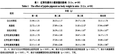 大棗黑色素對小白鼠休重的干擾如表1所顯示,伴隨著喂養(yǎng)時間的變化,每組小白鼠休重均有提升,而高脂肪組小白鼠休重較空白試驗組提升4.83g(p<0.05),說明長期性高脂肪膳食會使小白鼠增加體重。在給與大棗黑色素干涉后,大棗黑色素低、中、高使用量組小白鼠相對性高脂肪組休重降低1.77.2.05、2.66g(p<0.05),表明大棗黑色素在一定水平上還可以抑止高脂肪飲食搭配造成 的小白鼠增加體重,且使用量越大,抑止作用越明顯。