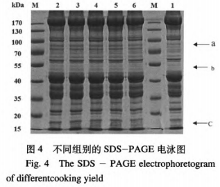 (3)在仿真模擬腌肉食品中加上TGase和豬肉皮膠原,經(jīng)SDS-PAGE變性凝膠電泳分析,TGase可讓仿真模擬肉食品中的肉蛋白質(zhì)與豬肉皮膠原產(chǎn)生化學(xué)交聯(lián),產(chǎn)生了新的蛋白質(zhì)分子。