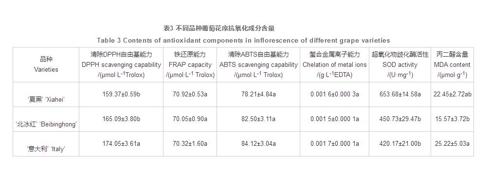由表3得知,消除DPPH氧自由基工作能力以‘西班牙’最強(qiáng),為174.05 μmol/L Trolox, 明顯強(qiáng)過其他2個(gè)種類;各種類花序的鐵復(fù)原工作能力基本一致,差別不明顯;消除ABTS氧自由基工作能力以‘西班牙’最強(qiáng),為84.12 μmol/L Trolox, ‘夏黑’最少,為78.21 μmol/L Trolox, 但種類間差別不明顯;3個(gè)品類的花序鰲合金屬離子工作能力均較低,均值為0.001 6 g/L EDTA;SOD活力以‘夏黑’最強(qiáng),為653.68 U·mg-1,明顯高過‘北冰紅’和‘西班牙’;MDA成分以‘西班牙’最大,為25.22 μmol/g,明顯高過‘北冰紅’,但與‘夏黑’無明顯差別。