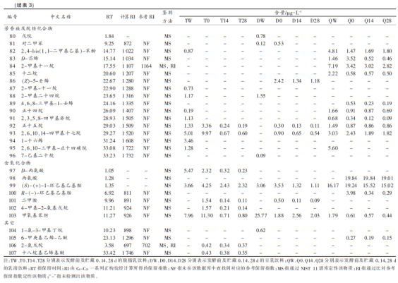 乳清蛋白飲品發(fā)醇前后左右關鍵在大環(huán)內(nèi)酯化學物質(zhì)、醛類化學物質(zhì)、脂環(huán)及乙烷化學物質(zhì)和含碳氫化合物上具有明顯差別(P<0.05);2-戊酮、2-辛酮、2-壬酮、2-十一酮、2-十三烷酮等大環(huán)內(nèi)酯化學物質(zhì)及1-庚醇、2-壬醇等醛類化學物質(zhì)在乳清蛋白發(fā)醇全過程中不斷地提升,在貯存歷程中,伴隨著貯存時間的變化其成分漸漸減少,在其中,2-壬酮由心酸的β-空氣氧化和癸酸的脫羧反應轉(zhuǎn)化成;2-羥基十一烷、十二烷、正十四烷、正十五烷等乙烷化學物質(zhì)及丙氨酸、叔丁基苯肟等含碳氫化合物在乳清蛋白發(fā)醇及貯存全過程中為成分漸漸減少。