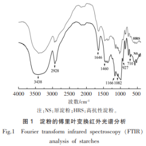 NS和HRS的紅外光譜圖如圖所示1所顯示。在NS光譜儀中,3438和2928cm-1處的強消化吸收峰各自相應(yīng)于O-H和C-H鍵伸縮式震動。在1082和1160cm-1相匹配的是C-O鍵伸縮式震動;1646cm-1處消化吸收峰與木薯淀粉內(nèi)部的羧基相關(guān),是醛基的C=O消化吸收峰。這種消化吸收峰在HRS中亦被觀查到,可是3438,2928和1646cm-1處的峰較差,說明HRS中甲基和醛基成分減少。NS在927cm-1上有D吡喃葡萄糖水的I型消化吸收帶,在709cm-1上有D-吡喃葡萄糖水的III型消化吸收帶,而HRS均沒有,表明原木薯淀粉經(jīng)加工處理后D-吡喃構(gòu)造被毀壞。