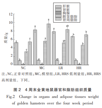圖2中展示了飼養(yǎng)4星期過后4組金黃地鼠人體器官品質(zhì)和脂肪細胞品質(zhì)比照。與常規(guī)對照實驗對比,高脂肪飲食搭配造成 肝部和腎臟功能品質(zhì)、附睪囊腫和腎周人體脂肪品質(zhì)明顯提升,人體內(nèi)臟的品質(zhì)提升源于于人體脂肪的很多累積;殊不知,每組間肝臟品質(zhì)無顯著性差異(P>0.05),說明短期內(nèi)內(nèi)高脂或HRS飲食搭配不容易顯著危害金黃地鼠的人體免疫系統(tǒng)。與常規(guī)對照實驗對比,高使用量HRS明顯減少了肝部和腎臟功能品質(zhì),抑止了由高脂肪飲食搭配誘發(fā)的脂肪細胞擴大,附睪囊腫和腎周人體脂肪品質(zhì)獲得有效的操縱。此結(jié)果與Martinez等的匯報一致,她們發(fā)覺生土豆抗性淀粉可降低脂肪細胞的產(chǎn)生。這主要是因為較高使用量抗性淀粉食材消化和吸收遲緩,合理降低了人體脂肪轉(zhuǎn)化成。