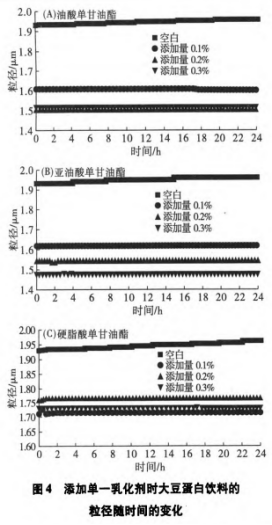 分散化系統(tǒng)的大概粒度及粒度分析體現(xiàn)了保濕乳液管理體系中分散介質(zhì)顆粒物的尺寸及均一水平,顆粒物越小、均一水平越高表明管理體系越平穩(wěn),因而分散化系統(tǒng)的大概粒度也是試品可靠性的影響因素之一。各自加上脂肪酸單甘油酯、脂肪酸單甘油酯及聚醚單甘油酯的大豆蛋白粉飲品的大概粒度隨時(shí)間和破乳劑加上量的變動(dòng)如圖4所顯示。