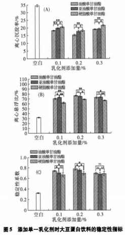 從圖5(A)能夠看得出,當(dāng)破乳劑加上量一致時(shí),脂肪酸單甘油酯做為增稠劑的大豆蛋白粉飲品離心式沉積率最少,表明管理體系相對(duì)性較平穩(wěn),即脂肪酸單甘油酯的破乳實(shí)際效果不錯(cuò)。圖5(B)說明,針對(duì)離心式飄浮比,加上脂肪酸單甘油酯和脂肪酸單甘油酯的大豆蛋白粉飲品相距并不大,其管理體系可靠性均好于加上硬酯酸單甘油酯的大豆蛋白粉飲品。圖5(C)說明,加上脂肪酸單甘油酯的大豆蛋白粉飲品的可靠性指數(shù)最大,即管理體系最平穩(wěn),而加上聚醚單甘油酯的大豆蛋白粉飲品可靠性相對(duì)來說較弱。