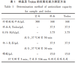 試品的抗氧化能力依據(jù)式(1)開展測算??寡趸芰χ狄訲roLox同樣抗氧化能力時的使用量(μMoLTroLox摩爾質(zhì)量/g)表明,即1g試品等同于TroLox的μMoL數(shù)。