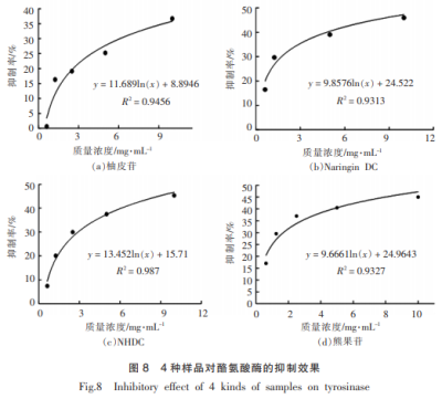 柚皮苷、NariNgiNDC、NHDC及熊果素4種試品對酪氨酸酶的抑制效果如圖所示8所顯示。依據(jù)不一樣濃度值的各試品對酪氨酸酶的抑制率,選用對數(shù)方程線性擬合,獲得擬合曲線如表7所顯示。依據(jù)線性擬合方程計(jì)算獲得iC50值。