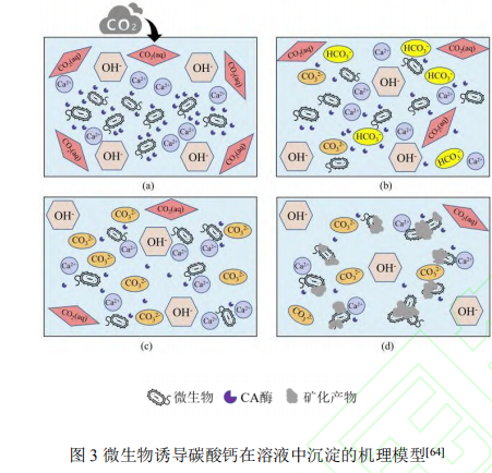 運用 CA 誘發(fā)酸化是一種高效率、平穩(wěn)、綠色生態(tài)友善且可長時間存儲 CO2的方式 。研究表明 CA 能夠加速 CaCO3的沉積速度,CaCO3 的關鍵晶相為白云石。研究表明 CA 有益于建立比較穩(wěn)定的CaCO3,并根據產生新的晶向明顯變化其形狀。CA誘發(fā) CaCO3 沉積的本質是催化反應水里 Ca2 和 CO2 的反映。微生物菌種產 CA 誘發(fā) CaCO3沉積原理如圖所示 3所顯示,(a)CA 病菌的繁衍和碳酸酐酶的造成;(b)HCO3-向 CO32-的生成和轉換;(c)CO32-的很多產生和 CA 病菌對 Ca2 的吸咐;(d)酸化物質的堆積。