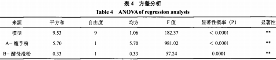 對取得的多元化回歸分析實體模型開展方差分析和顯著性檢驗,結(jié)果見表4,磨芋分、酵母菌浸粉和硫酸錳對酶活有極其明顯(p<0.01實體模型的擬合程度(R-Squared)為0.9958,精確測量頻率穩(wěn)定度(AdeqPrecision)為48.993超過4;實體模型的糾正決定系數(shù)(AdjR-Squared)為0.9903且Pred-R-Squared為0.9323,彼此之間的差別低于0.2。
