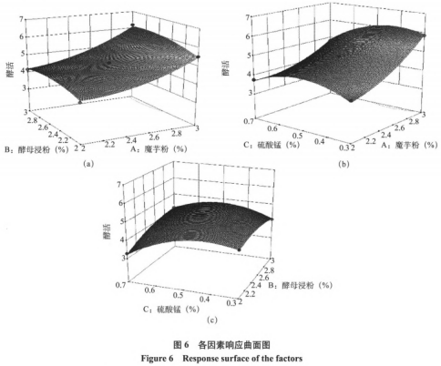 三要素兩者之間的回應(yīng)斜面見圖6,從這當(dāng)中能夠看得出三者中間有顯著的配對t檢驗。在試驗設(shè)計范疇以內(nèi),從圖6-a和圖6-b能夠看得出,在酵母菌浸粉和硫酸錳的增加量固定不動不會改變的情形下,產(chǎn)酶魅力伴隨著魔芋精粉加入量的提高而擴(kuò)大;從圖6-a和圖6-c能夠看得出,在魔芋精粉和硫酸錳加上量固定不動的情形下,酶魅力伴隨著酵母菌浸粉加上量的提升先升高后逐漸降低;從圖6–b和圖6-c可看得出,在魔芋精粉和酵母菌浸粉加上量固定不動不會改變的情形下,產(chǎn)酶魅力伴隨著硫酸錳加上量的提升先升高后逐漸降低。