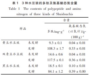 3種水豆豉的活性多肽及氨基酸態(tài)氮成分見表1。未經(jīng)由發(fā)醇制取的水豆豉中活性多肽成分小于20mg/g。經(jīng)解木薯淀粉枯草芽孢菌CAUnDJ118發(fā)醇后,雙青豌豆水豆豉中活性多肽成分最大為117.5mg/g,次之為大豆水豆豉(108.3mg/g)、大黑豆水豆豉(84.1mg/g)。發(fā)醇雙青豌豆、大豆、大黑豆水豆豉的活性多肽成分比沒經(jīng)發(fā)醇的水豆豉各自提升了12,8,5倍。未發(fā)醇水豆豉的氨基酸態(tài)氮成分也較低(0.01%~0.04%),而進行發(fā)酵后的大黑豆、雙青豌豆、大豆水豆豉的氨基酸態(tài)氮成分各自為0.39,0.36,0.33g/100g,比未發(fā)醇時各自提升了4,9,8倍。