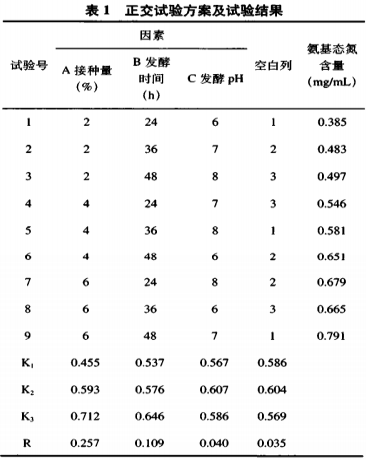 在固定不動料液比l:4(g/mL),發(fā)醇溫度37℃和葡萄糖水加上量2%的根基上,對單要素實驗的信息效果開展解析并選擇適合的發(fā)醇標準范疇,以發(fā)醇pH、接種量、發(fā)酵時間為首要要素,并以測量的羥基態(tài)氮成分做為參照,開展三要素三水準L9(33)正交和提升實驗,實際試驗方案和結(jié)果見表1。