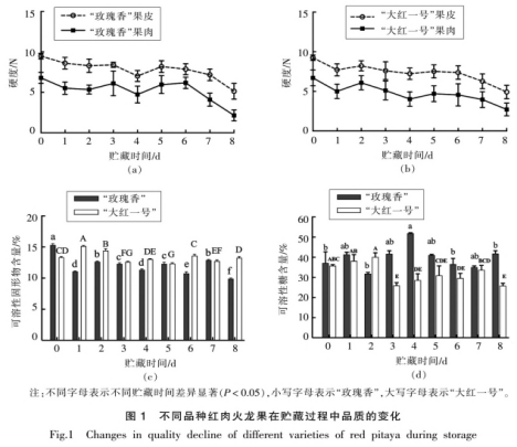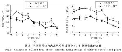 VC也是火龍果中重要的營養(yǎng)成分之一,能維持活性氧代謝平衡、延緩后熟軟化,是果實內(nèi)清除活性氧的一種重要的抗氧化劑,對延緩果實衰老有一定效果。“玫瑰香”品種和“大紅一號”品種火龍果的VC含量如圖2b所示,隨著貯藏時間的增加,VC含量均呈現(xiàn)下降趨勢,與總酚含量的變化趨勢一致,說明隨著貯藏時間增加,果實逐漸軟化腐敗,火龍果的抗氧化能力下降。