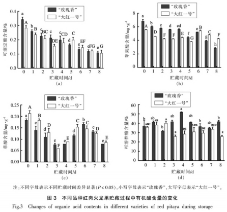 有機酸含量是影響果實風(fēng)味品質(zhì)的重要因素,不同的主要有機酸種類構(gòu)成了果實特殊的風(fēng)味。“玫瑰香”品種火龍果和“大紅一號”品種火龍果的可滴定酸含量如圖3a所示,在貯藏期間呈現(xiàn)下降趨勢,這是由于有機酸作為呼吸底物,通常在TCA循環(huán)中被降解。通過測定“玫瑰香”品種和“大紅一號”品種火龍果中7種有機酸(分別為蘋果酸、草酸、酒石酸、檸檬酸、琥珀酸、富馬酸和乳酸)含量的變化趨勢,得出蘋果酸為2個品種火龍果中含量最高的有機酸,這與Bellec等的研究結(jié)果一致,說明可滴定酸含量下降主要是由蘋果酸含量下降導(dǎo)致的。