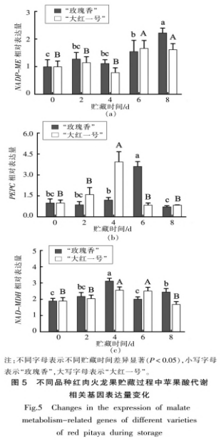 紅肉火龍果采后品質(zhì)劣變由果皮和果肉硬度下降及可滴定酸、抗壞血酸、總酚含量降低共同導(dǎo)致。蘋(píng)果酸為紅肉火龍果果實(shí)中有機(jī)酸的主要成分,其含量變化導(dǎo)致果實(shí)有機(jī)酸含量下降。負(fù)責(zé)蘋(píng)果酸合成的NAD-MDH和PEPC的酶活性與蘋(píng)果酸含量呈正相關(guān)。而負(fù)責(zé)蘋(píng)果酸降解的NADP-ME則與蘋(píng)果酸含量呈負(fù)相關(guān)。進(jìn)一步研究測(cè)定蘋(píng)果酸相關(guān)代謝酶NADP-ME、PEPC和NAD-MDH基因水平變化,發(fā)現(xiàn)蘋(píng)果酸代謝相關(guān)基因水平的變化與酶活的變化趨勢(shì)一致?;瘕埞珊筚A藏過(guò)程中,PEPC和NAD-MDH的基因水平呈下降趨勢(shì),而NAD-MDH的基因水平呈上升趨勢(shì),使得果實(shí)中蘋(píng)果酸合成受阻,降解加劇,最終導(dǎo)致蘋(píng)果酸含量下降,火龍果在貯藏過(guò)程中品質(zhì)變劣。