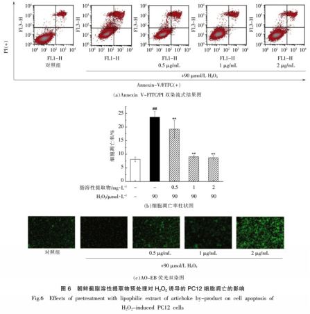 為了更加直觀地比較不同處理組的細(xì)胞凋亡情況,利用A0-EB對(duì)細(xì)胞進(jìn)行染色,通過(guò)熒光顯微鏡觀察細(xì)胞形態(tài)。如圖6c所示,空白對(duì)照組的細(xì)胞因?yàn)檫灌こ?A0)透過(guò)其完整的細(xì)胞膜嵌入DNA,幾乎全部呈現(xiàn)綠色熒光,細(xì)胞形態(tài)正常。沒(méi)有明顯的凋亡相關(guān)形態(tài)學(xué)改變;經(jīng)H202處理的模型組的細(xì)胞發(fā)生了邊緣化、核凝集等發(fā)綠色熒光的早期凋亡現(xiàn)象,并且因?yàn)殇寤义V(EB)透過(guò)其破損的細(xì)胞膜嵌入DNA,呈現(xiàn)出橘黃色熒光的晚期凋亡現(xiàn)象:而經(jīng)過(guò)朝鮮薊脂溶性提取物預(yù)處理的PCI2細(xì)胞呈現(xiàn)出早期凋亡和晚期凋亡細(xì)胞皆有減少的現(xiàn)象,并呈現(xiàn)質(zhì)量濃度依賴(lài)性。