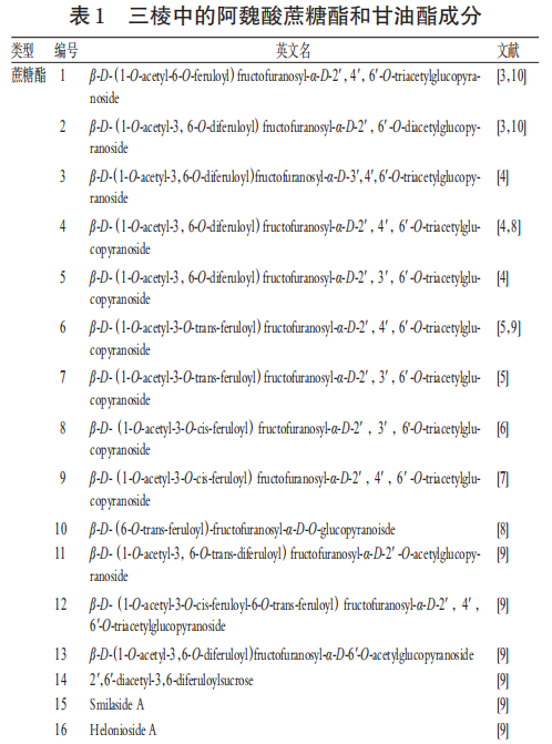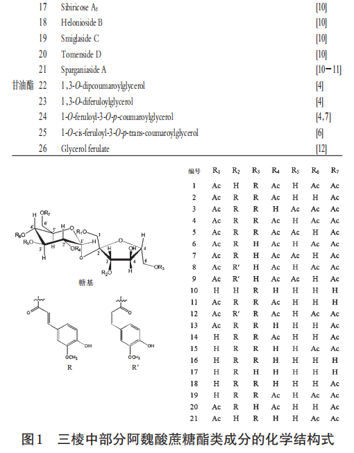 三棱以阿魏酸、p-香豆酸以及二者蔗糖酯、甘油酯的衍生物為主要成分,目前共發(fā)現(xiàn)21個阿魏酸蔗糖酯衍生物和5個阿魏酸及p-香豆酸甘油酯衍生物,其具體化合物名稱見表1,部分成分化學(xué)結(jié)構(gòu)式見圖1。由圖1可見,阿魏酰基常連在果糖的3、6位上,糖基上有不同程度的乙?;鶊F(tuán)(0~4 個乙?;┤〈籆6-C3部位的雙鍵既有反式又有順式結(jié)構(gòu),其中反式雙鍵較穩(wěn)定且更為常見。