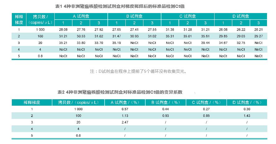 將B646L基因標(biāo)準(zhǔn)品稀釋至1000copies/μL、100copies/μL、20copies/μL、4copies/μL、0.8copies/μL,共5個稀釋度,使用4種試劑盒,按照其說明書配置PCR體系,進(jìn)行熒光PCR檢測,每個稀釋度重復(fù)3次,同時設(shè)置陰陽性對照。分析各試劑盒對不同梯度核酸檢測Ct值,比較不同試劑盒對各稀釋度的檢出率和變異系數(shù)。