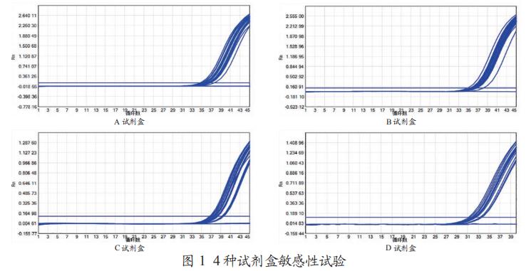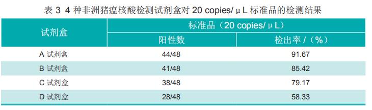 將B646L基因標(biāo)準(zhǔn)品稀釋至20copies/μL,使用4種試劑盒對稀釋后的標(biāo)準(zhǔn)品進(jìn)行熒光PCR擴(kuò)增,每種試劑盒重復(fù)檢測48個孔,統(tǒng)計該拷貝數(shù)下不同試劑盒的檢出率。
