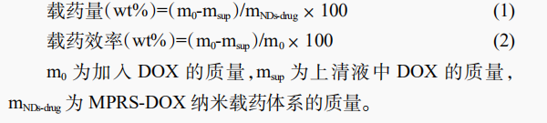 為了驗(yàn)證DOX是通過共價連接MPRS,采用紫外-可見分光光度計檢測MPRS、DOX、MPRS-DOX在800~200nm波長范圍內(nèi)的紫外-可見光譜。取適量MPRS分散液、DOX溶液、MPRS-DOX分散液稀釋至一定的濃度,然后利用紫外-可見分光光度計檢測。將MPRS與不同濃度(0.1,0.2,0.4,0.8,1mg/mL)的巰基化阿霉素溶液混合,在37℃避光振蕩24h,以12500r/min離心45min,收集上清液,通過紫外分光光度計測試其載藥能力。根據(jù)公式(1)和(2)推算出MPRS-DOX的載藥量以及載藥效率。