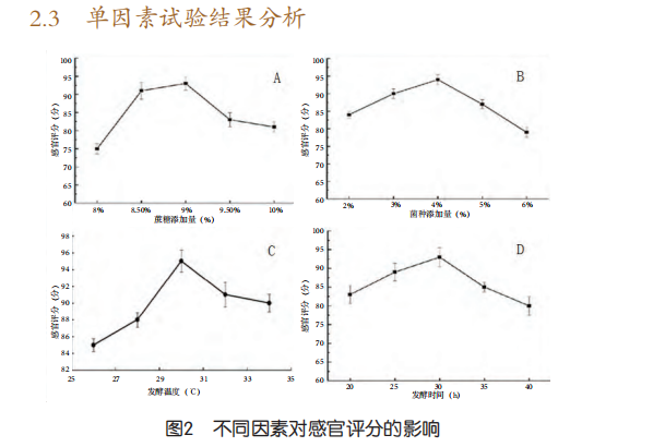 在發(fā)酵過(guò)程中,糖添加量、菌種添加量、發(fā)酵溫度和發(fā)酵時(shí)間均對(duì)發(fā)酵乳感官評(píng)分影響較大。用牦牛奶與荷斯坦牛奶比例為2:1進(jìn)行單因素試驗(yàn),結(jié)果如圖2所示: