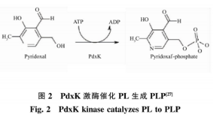 但是大腸桿菌為非食品安全菌株,在發(fā)酵過程中易產(chǎn)生內(nèi)毒素,并且需要添加價格昂貴且有毒害作用的IPTG作為誘導(dǎo)劑誘導(dǎo)產(chǎn)酶,其生產(chǎn)得到的GAD安全性不高,距離滿足食品和醫(yī)藥領(lǐng)域的要求還有一定差距??莶菅挎邨U菌是通過美國食品和藥物管理局GARS認(rèn)證的安全菌株,廣泛應(yīng)用在食品、醫(yī)藥生產(chǎn)中。然而在枯草芽孢桿菌中缺少PdxH,所以無法利用添加輔酶前體PN的方式,通過PLP補(bǔ)救途徑將PN轉(zhuǎn)化為PLP,從而提高GAD酶活力。目前,大量的研究集中在以枯草芽孢桿菌為宿主生產(chǎn)GAD,在酶轉(zhuǎn)化過程中通過直接添加輔酶PLP提高轉(zhuǎn)化效率,如丁偉等運用安全宿主枯草芽孢桿菌生產(chǎn)GABA,在其轉(zhuǎn)化過程巾直接添加PLP,全細(xì)胞催化GABA產(chǎn)量為239.91g/L,轉(zhuǎn)化率54.48%。由于PLP價格昂貴,導(dǎo)致生產(chǎn)成本較高,無法適應(yīng)工業(yè)化生產(chǎn)需求。關(guān)于在枯草芽孢桿菌為宿主生產(chǎn)GAD發(fā)酵過程中,添加價格低廉的輔酶前體以提高GAD酶活力的研究未見報道。因此作者以枯草芽孢桿菌(Bacillussubtilis)為宿主,通過基因工程將大腸桿菌來源的谷氨酸脫羧酶基因(gadB)在B.sMbtilis中異源表達(dá),添加相對廉價的輔酶前體PL,通過PdxK介導(dǎo)的PLP補(bǔ)救途徑將其轉(zhuǎn)化生成PLP(見圖2),從而提高酶活和產(chǎn)量,降低生產(chǎn)成本。