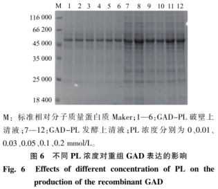 將-80℃保存的重組菌B.subtilis/pHY300PLK-gadB以體積分?jǐn)?shù)0.2%接種至含20μg/mL四環(huán)素的LB液體培養(yǎng)基中,恒溫?fù)u床37℃、200r/min擴(kuò)大培養(yǎng)8~10h,再以體積分?jǐn)?shù)5%轉(zhuǎn)接至含20μg/mL四環(huán)素的TB發(fā)酵培養(yǎng)基中,恒溫?fù)u床37℃、200r/min培養(yǎng)2~3h后分別加入一定濃度的PLP、PL、PN,于恒溫?fù)u床33℃、200r/min進(jìn)行重組蛋白質(zhì)的表達(dá)。發(fā)酵過程中在不同時(shí)間取樣,測(cè)0D600。12000r/min離心1min得到菌體和發(fā)酵上清液。將菌體用1mL、50mmol/L、pH5.0的Na2HP04-檸檬酸緩沖液重懸,加入0.6mg/mL溶菌酶,在37℃反應(yīng)30min后置于冰水中超聲破碎,12000r/min離心5min得到破壁上清液和破壁沉淀,使用SDS-PAGE檢測(cè)其蛋白質(zhì)。