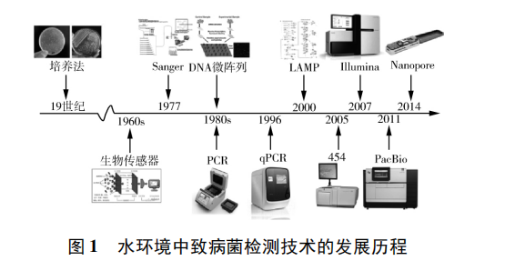 近年來,水環(huán)境中致病菌的檢測取得了一定的研究進展,已從單一基于培養(yǎng)法的傳統(tǒng)致病菌檢測方法發(fā)展至多種分子生物學檢測方法,這些技術(shù)的出現(xiàn)和發(fā)展為致病菌檢測提供了新的思路。水環(huán)境中致病菌檢測技術(shù)的發(fā)展歷程見圖 1。