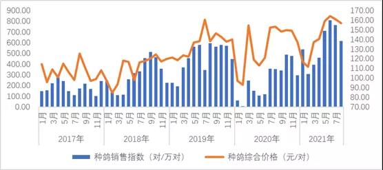 8月份,種鴿綜合性價錢為157.13元/對,同比下降2.5%,起伏指數(shù)值為0.27,為一般起伏。構造上看,青年人鴿價錢較穩(wěn),童鴿價錢有一定的下降。最高成交價為230元/對,最少為45元/對。銷售量層面,檢測公司種鴿市場銷售指數(shù)值為617.24,環(huán)比下降19%,以往當期銷售量一般增漲,由此可見盡管銷售量比當期高,但仍維持上一期減溫下降的發(fā)展趨勢。構造上看,種鴿銷售量變化的公司中,降低的居多。