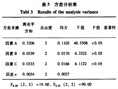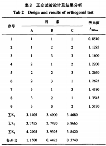 超音波法獲取梔子黃黑色素的正交實(shí)驗(yàn)結(jié)果及數(shù)據(jù)處理方法見表2和表3。依據(jù)顯著性檢驗(yàn)得知,酒精濃度值對梔子黃色素提取率的危害比較明顯,獲取溫度和獲取時(shí)間對梔子黃色素提取率的危害較小,不明顯,梔子黃黑色素的較佳獲取加工工藝標(biāo)準(zhǔn)為:A3B3C2。因?yàn)楂@取溫度是是非非顯著性差異影響因素,從電力能源節(jié)省和工業(yè)生產(chǎn)中的社會(huì)經(jīng)濟(jì)要素等層面考慮到,因此 選擇A3B2C2為最好獲取加工工藝,即獲取有機(jī)溶劑為60%的乙醇溶液,獲取溫度為45℃,獲取的時(shí)間為20min。