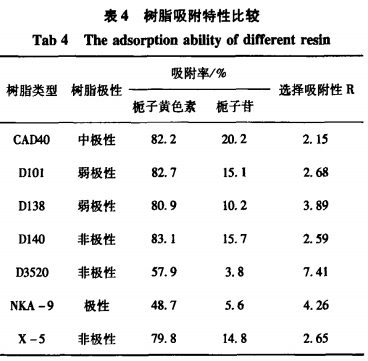 7種環(huán)氧樹脂對梔子黃黑色素的粘附實(shí)際效果見表4。由表剖析得知,7種大孔樹脂對梔子黃黑色素的粘附率都明顯高過梔子苷,表明這幾類環(huán)氧樹脂對梔子黃黑色素和梔子苷均具備可選擇性。在其中CAD40、D101、D138、D140這4種環(huán)氧樹脂對梔子黃黑色素的粘附率非常高,都做到80%之上;D3520和NKA-9環(huán)氧樹脂對梔子黃黑色素的粘附率盡管不高,可是這2種環(huán)氧樹脂的挑選吸附力不錯(cuò),對梔子苷的吸咐最少。從吸咐容積和可選擇性兩層面考慮到,采用黑色素吸咐率最高的的D140環(huán)氧樹脂和挑選吸附力最好是的D3520環(huán)氧樹脂開展梔子黃黑色素的特制實(shí)際效果較為。