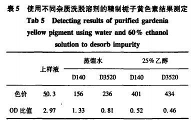 由表5得知,歷經(jīng)環(huán)氧樹脂特制后,梔子黃黑色素的色價(jià)明顯增強(qiáng),OD比率降低,表明梔子黃黑色素中梔子苷的相應(yīng)成分有些降低,二種成份獲得了一定程度上的分離出來。與用純凈水洗對比,應(yīng)用25%的酒精來過柱殘?jiān)軌蚴箺d子黃黑色素的色價(jià)進(jìn)一步上升,做到400之上,OD比率也下滑至0.5上下。因此 采用25%的酒精來過柱殘?jiān)軌蛟诤谏負(fù)p害較小的情形下進(jìn)一步減少OD比率,提升黑色素品質(zhì)。