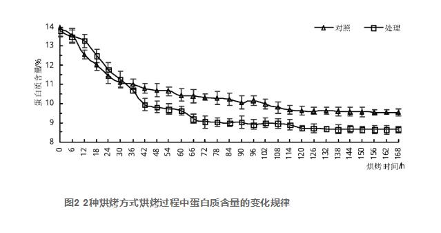 由圖2得知,烤制全過程中2種烤制方法的蛋白質(zhì)含量轉(zhuǎn)變呈現(xiàn)出下降趨勢(shì),但不一樣的烘干方法降低的效率不一樣,在30 h前對(duì)比和處置的變動(dòng)差別并不大,30 h后處理工藝顯著小于對(duì)比。在其中,對(duì)比在0~30 h蛋白的溶解速度為每鐘頭0.09五個(gè)點(diǎn),30~120 h為每鐘頭0.01七個(gè)點(diǎn);解決在0~42 h的溶解速度為每鐘頭0.09兩個(gè)點(diǎn),42~120 h為每鐘頭0.016個(gè)點(diǎn);2種方法均在120 h后轉(zhuǎn)變不顯著。